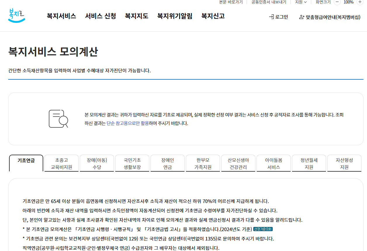 복지로의 모의계산 서비스를 이용하면 기초 노령연금의 소득 인정액을 빠르게 계산할 수 있습니다.