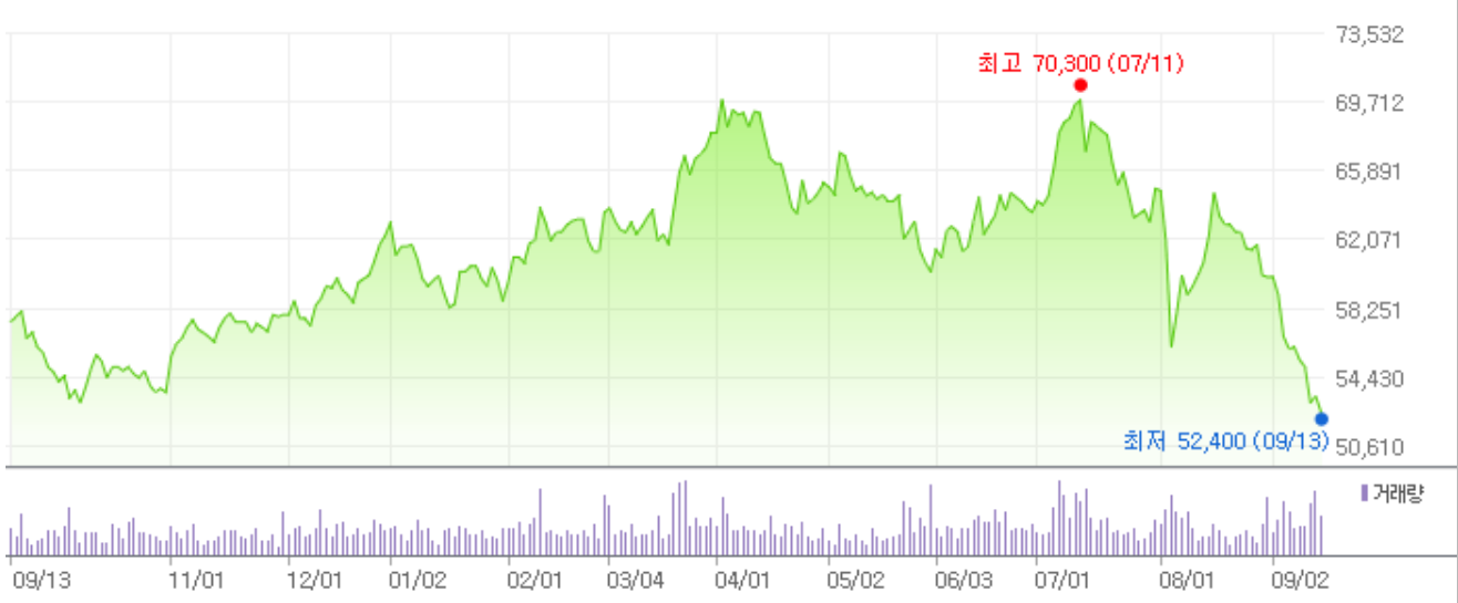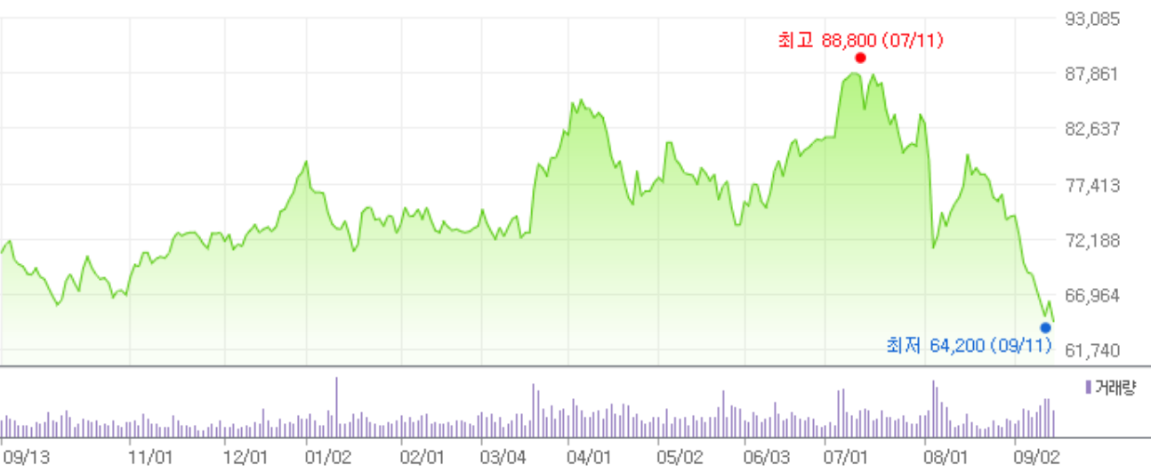 최근 삼성전자 주식이 많이 떨어졌습니다. 1년 주가 차트를 보면 최저점인 걸 알 수 있죠. 삼성전자가 아직 건전한 회사라고 생각한다면 지금 매수해야 한다고 생각합니다. 저도 삼성전자를 매수했는데요. 저는 장기로 보지는 않고 7만 원 후반이나 8만 원으로 오르면 팔 생각입니다.