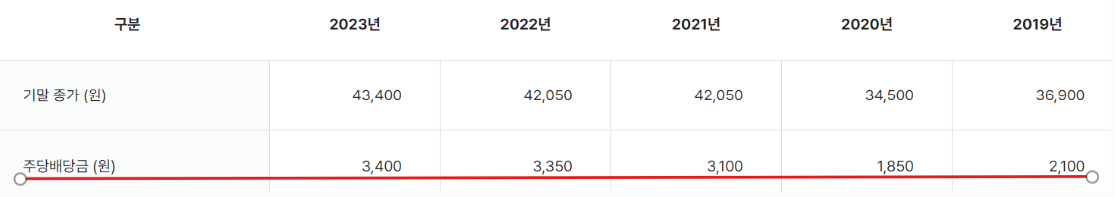 배당금은 1~3분기는 600원으로 배당하고 4분기는 다른 분기에 비해 높은 배당금을 지급합니다. 2023년 연간 총 배당금은 3,400원이었죠. 하나금융지주의 배당금이 매년 성장하고 있는데 과연 올해도 오를지 궁금합니다.