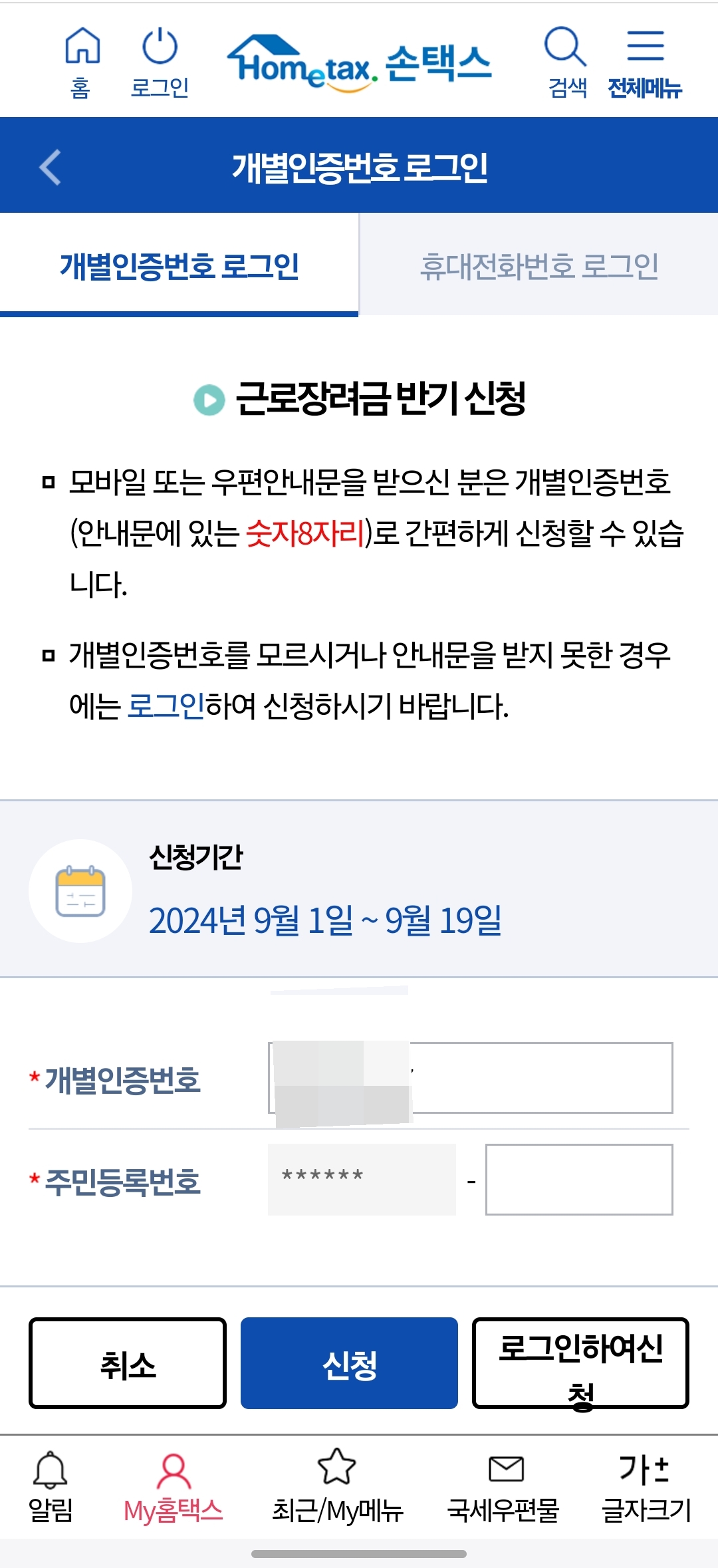 저는 이번에는 핸드폰으로 신청했는데요. 대상자는 카톡으로 알림이 오고 카톡에서 링크로 접속하면 개별인증번호가 입력되어 있어서 주민번호만 입력하면 됩니다.