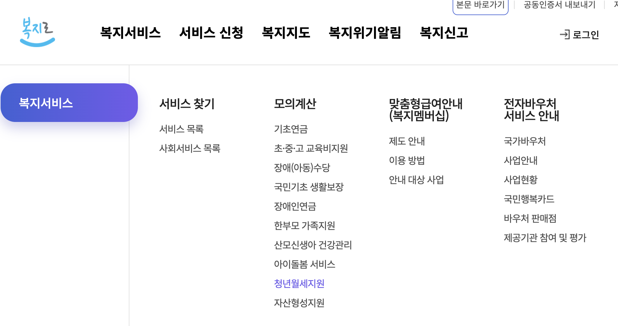 복지로>복지서비스>모의계산>청년월세지원